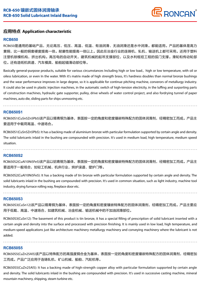 The RCB650 is a universal basic product, regardless of high pressure, low pressure, high temperature, low temperature, oil lubrication, oil free lubrication or water lubrication. All can be applied. The matrix of the product is high force brass, which is twice as hard as the ordinary copper sleeve. The wear resistance is more than doubled. Therefore, it can be used in continuous casting machines, rolling mills and conveyors in the metallurgical industry. Also used in plastic injection molding machine mold locking mechanism, extrusion mechanism. The automatic switch of high voltage electricity, the lifting support part of construction machinery, and the arc door support of water conservancy project. Pulley and drive wheel parts. There are paper machine drying track, automobile mold, ship anchor sliding parts, etc.