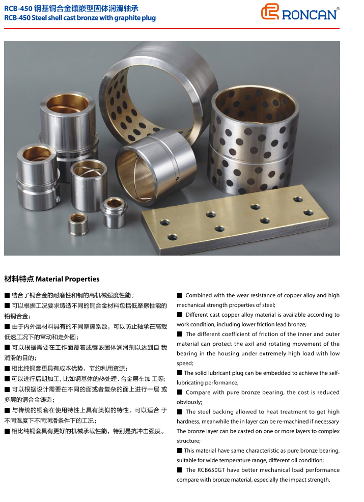 RCB450結合了金屬與非金屬的優點,特別適合于高載低速而又無法加油或不能加油的工作場合,如大型港口機械、軋鋼機械、模具行業以及沖壓設備等。
